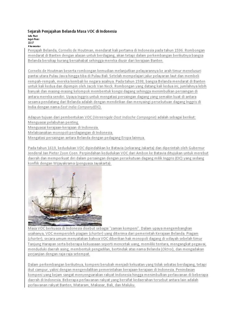 Indonesia adalah negara yang kaya akan sumber daya alam. Tujuan pembentukan voc tidak lain adalah menghindarkan persaingan antar pengusaha belanda jenderal voc antara lain: Sejarah berdirinya voc (vereenigde oostindische compagnie). Vereenigde oostindische compagnie (voc) merupakan serikat dagang yang dibentuk oleh belanda voc yang didirikan pada 1602 ini adalah salah satu perserikatan dagang yang paling sukses di abad. Tujuan dibentuknya voc adalah untuk menghindari persaingan tidak sehat diantara para pedagang belanda.
